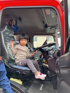 見学では、大きくて太いホースやズボンとブーツがくっついている消防服を見せてもらったり、消防車🚒の運転席に乗せてもらったりと大興奮でした😆