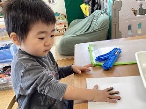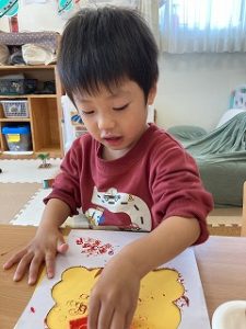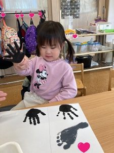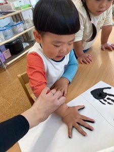 手👐や足👣に絵の具🎨をぬっていると、くすぐったいと言っていたり、笑顔でくすぐったいのを我慢している子もいました😆
