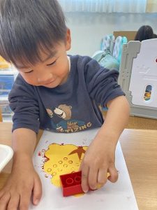 葉っぱ🍃作りでは、普段使っているブロックを絵の具🎨につけてポンポンと・・・✨